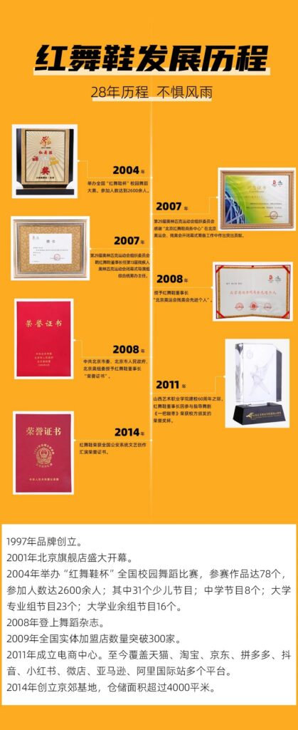 二十八年来,在舞蹈、形体训练及各种演艺领域均享有盛誉,并将产品延伸至瑜伽、健身、户外、休闲等领域,倍受业内人士推崇喜爱。我们将秉承“讲传奇故事,圆舞者之梦,塑窈窕身材,铸辉煌品质”的经营理念,为广大舞蹈艺术家和舞蹈爱好者们提供越来越好的服务和支持。